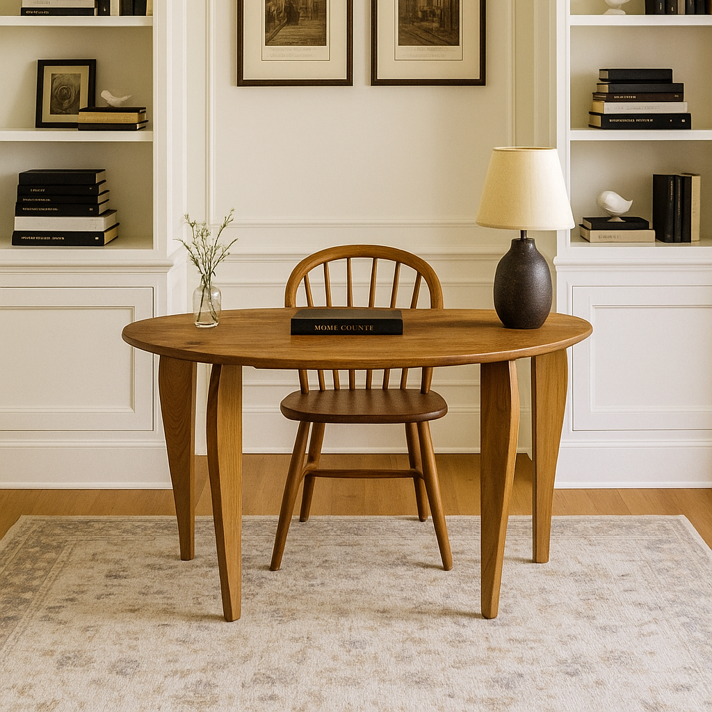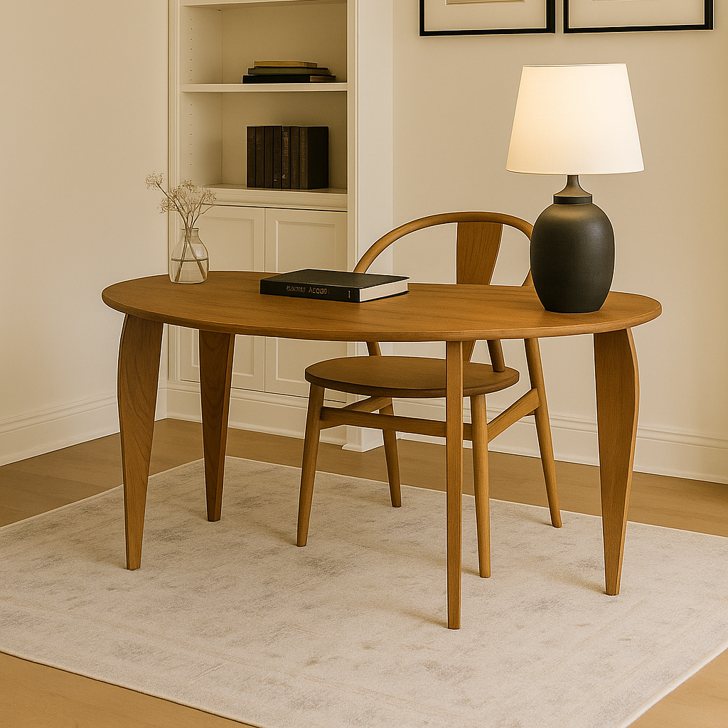Ahşap çalışma masası, masif ceviz ağacından üretilmiş olup, oval tasarımı ve doğal dokusuyla çalışma alanınıza zarif bir dokunuş katar. Ceviz ağacının sunduğu sıcaklık, her dekorasyonla uyum sağlayarak ofis veya ev ofisinde şıklık yaratır. Dayanıklı yapısı ve geniş yüzeyi, bilgisayar, yazı işleri veya diğer ofis ihtiyaçlarınız için ideal bir çalışma alanı sunar. Fasulye masa, sağlam ahşap ayaklar ve metal vidalar ile desteklenmiş olup uzun yıllar boyunca güvenle kullanılabilir. Estetik ve fonksiyonelliği bir arada sunan bu tasarım, ofis ortamınıza modern bir hava katar.