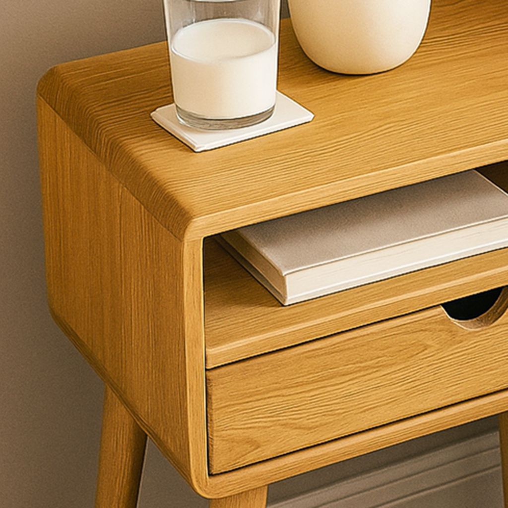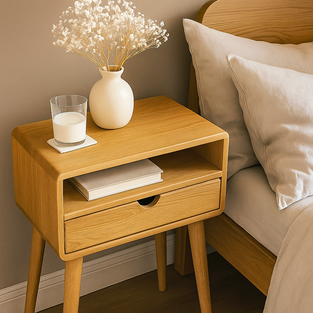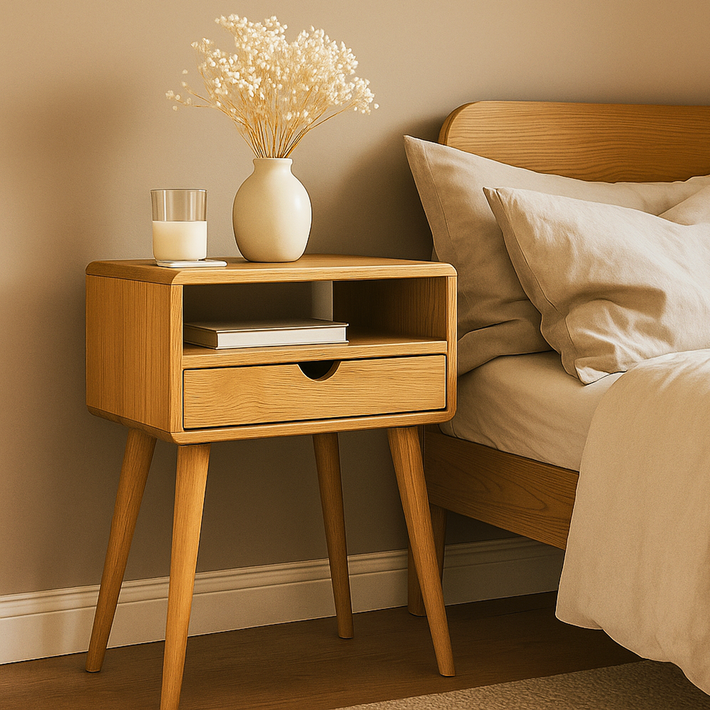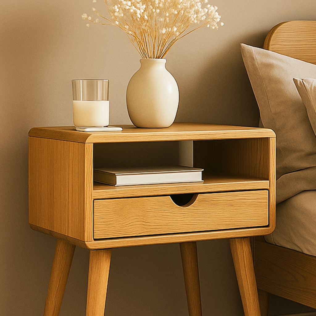 Ahşap komodin, masif meşe ağacından üretilmiş olup, konik ayak yapısı ve çekmeceli tasarımıyla yatak odanıza estetik ve fonksiyonellik katar. Ceviz ağacının naturel ve sıcak dokusu komodininizin her dekorasyonla uyumlu olmasını sağlar. Çekmece ve açık raf bölmesi, eşyalarınızı düzenli tutmanıza yardımcı olur. Yüzyıl ortası modern tarzı, minimalist tasarımı ve kompakt ölçüleri ile dar alanlarda bile mükemmel bir çözüm sunar. Çekmeceli komodin, hem şıklık hem de kullanım kolaylığı sunarak yatak odası, oturma odası veya antre gibi farklı alanlarda işlevsel bir seçenek olur.