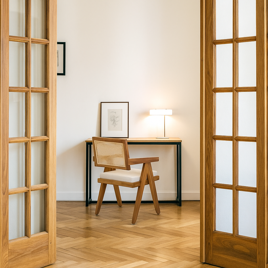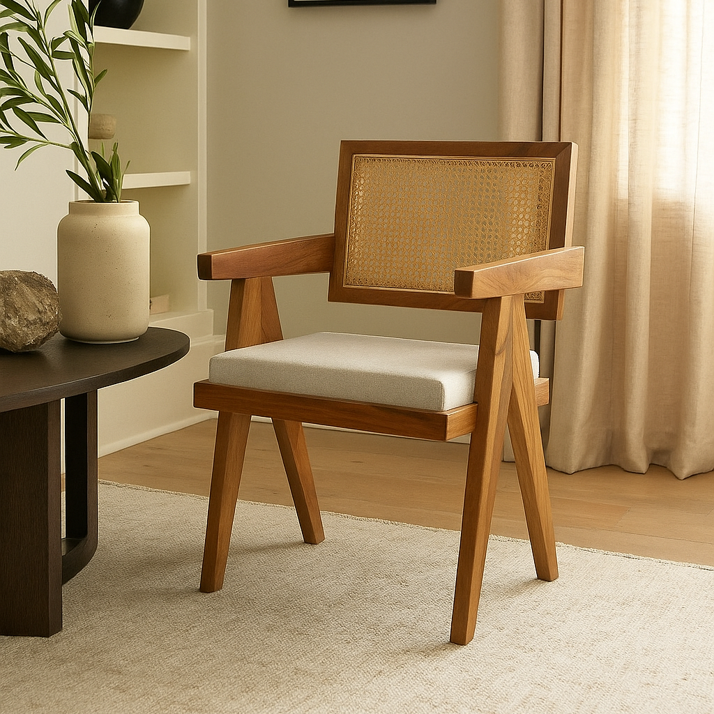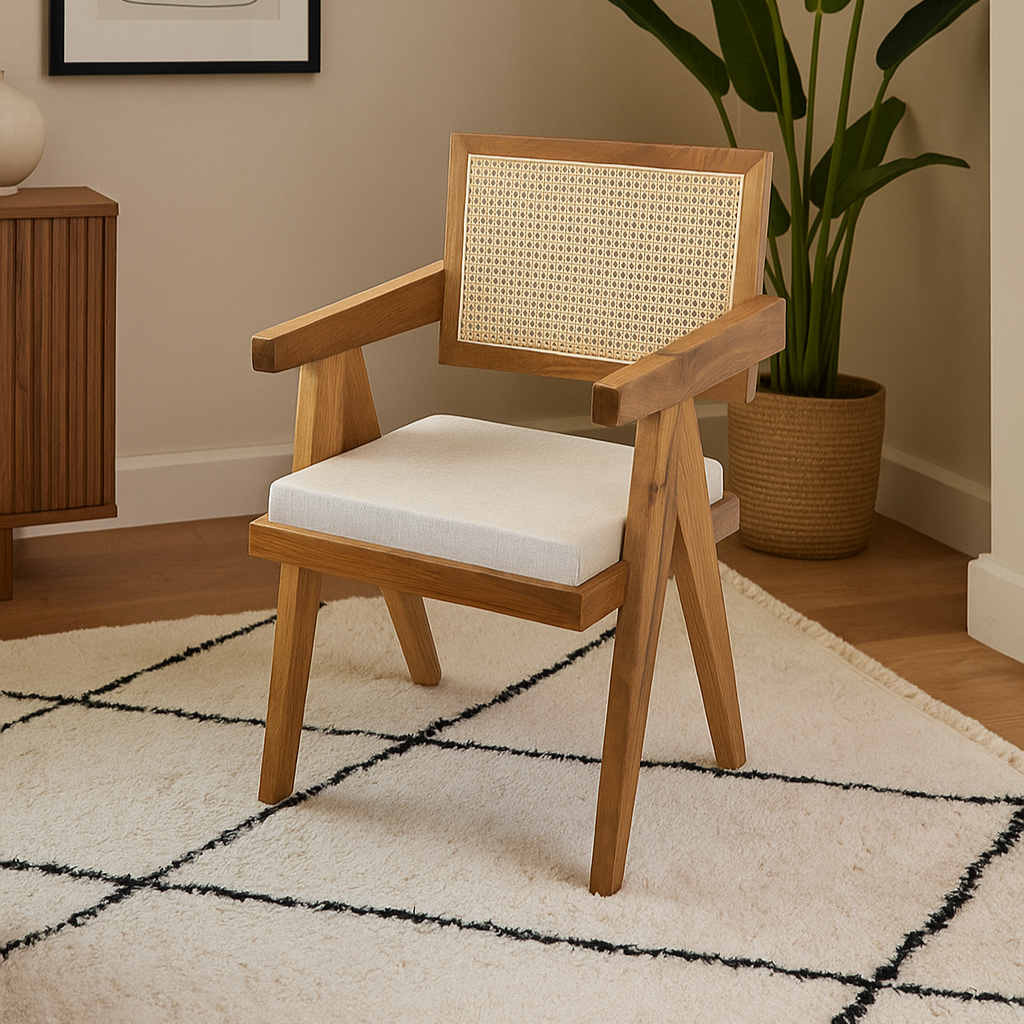 Pierre Jeanneret’in çağdaş ve doğal çizgilerinden esinlenerek tasarladığımız sandalyemiz, hem retro hem de modern dekorasyonda kolayca kendine yer bulur. Oturma kısmında yer alan yumuşak minder, uzun süreli oturumlarda konfor sağlar. İster yemek odasında ister çalışma alanında kullanın, bu sandalye her ortamda şıklığı ve rahatlığıyla öne çıkar.