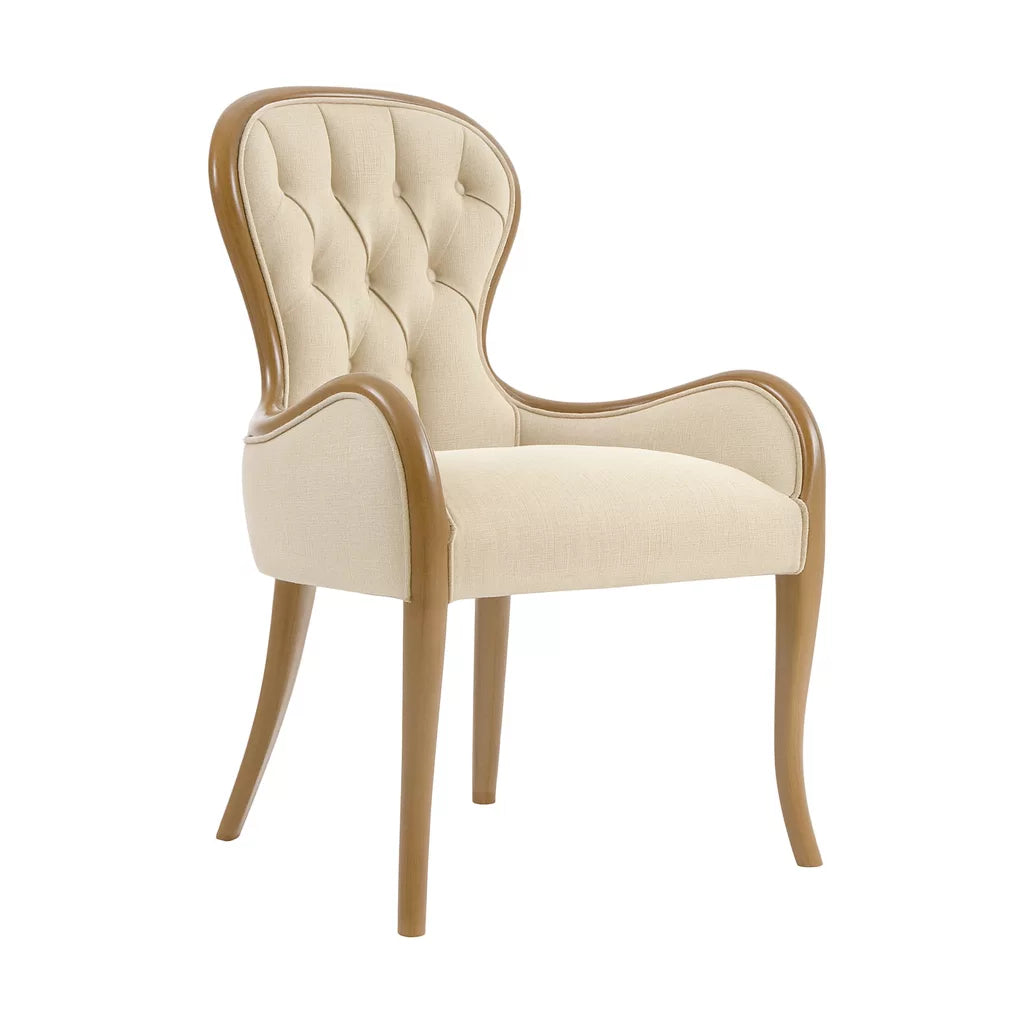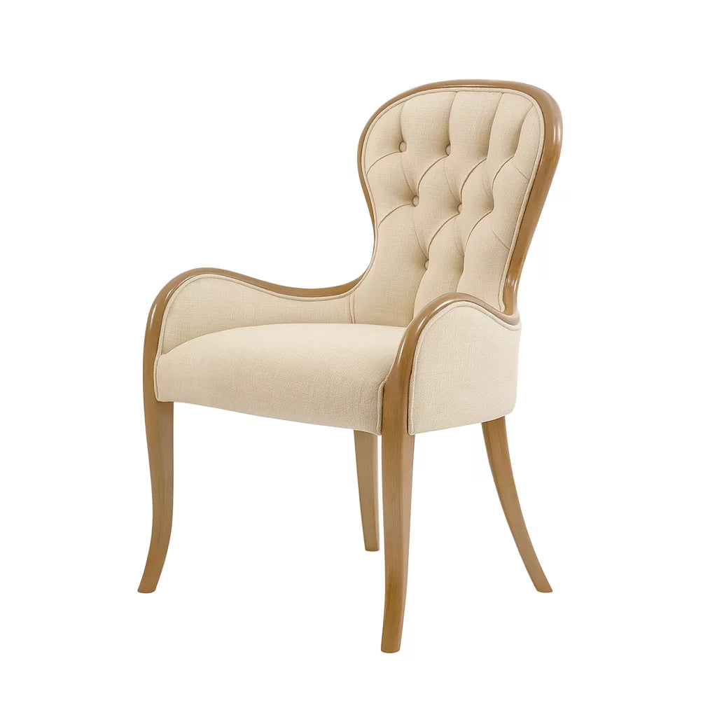 Bu sandalye, masif ağaç kullanılarak üretilmiştir. Klasik tasarım anlayışına sahiptir. Lükens formundaki oyma ayak yapısı ve sırt bölümündeki kapitone döşeme detayları öne çıkar. Ürün hem salon hem de yemek odası kullanımına uygundur. Tasarım, estetik görünüm ve oturma konforu birlikte düşünülerek hazırlanmıştır.