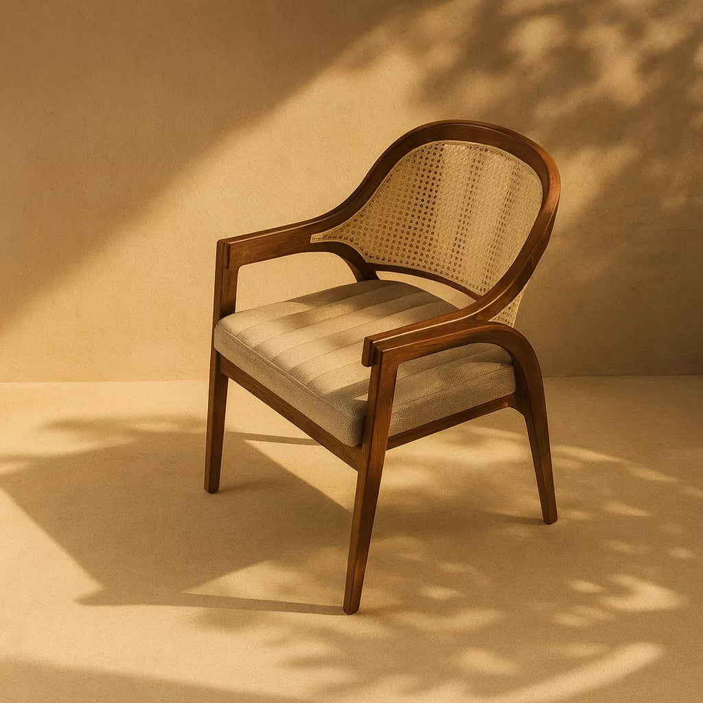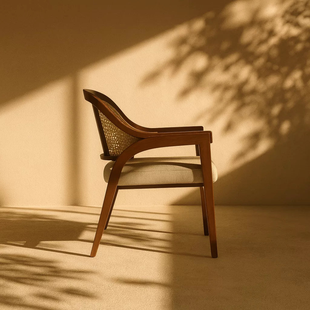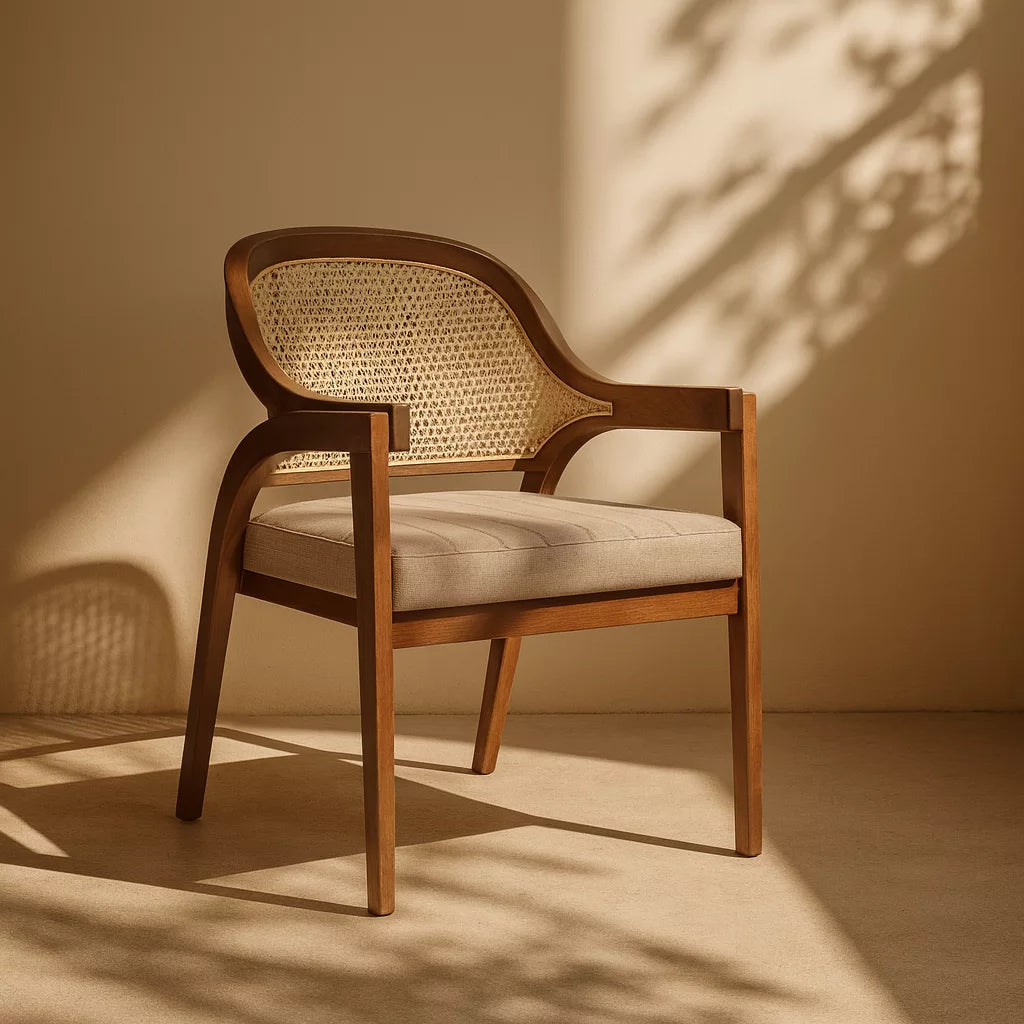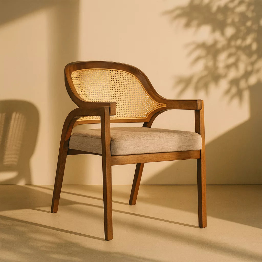 Bu sandalye, masif kayın ağacı ve doğal hazeran örgü kullanılarak üretilmiştir. Hazeran sırt yapısı mekana hafif ve ferah bir görünüm kazandırır. Masif ahşap iskelet, uzun süreli ve güvenli kullanım sağlar. Ürün hem estetik hem de dayanıklılık dikkate alınarak tasarlanmıştır.