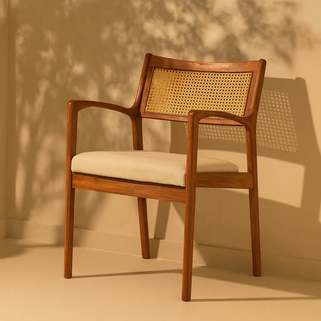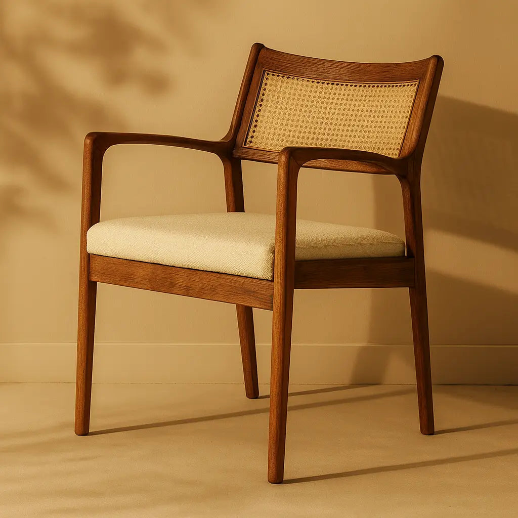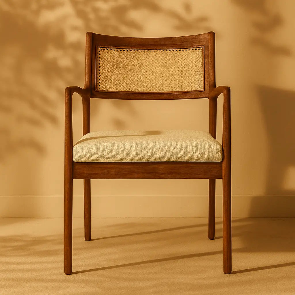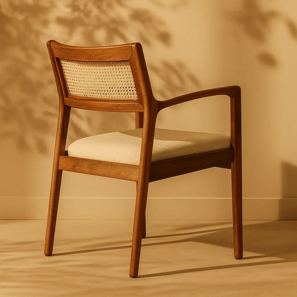 Bu sandalye, masif kayın ağacından üretilmiştir. İskandinav tasarım anlayışına uygun sade ve dengeli bir forma sahiptir. Sırt bölümünde doğal hazeran örgü kullanılmıştır. Gövdeyle bütünleşik kavisli kolçak yapısı, ürüne akıcı bir görünüm kazandırır. Sandalye hem konfor hem de uzun süreli kullanım dikkate alınarak tasarlanmıştır.
