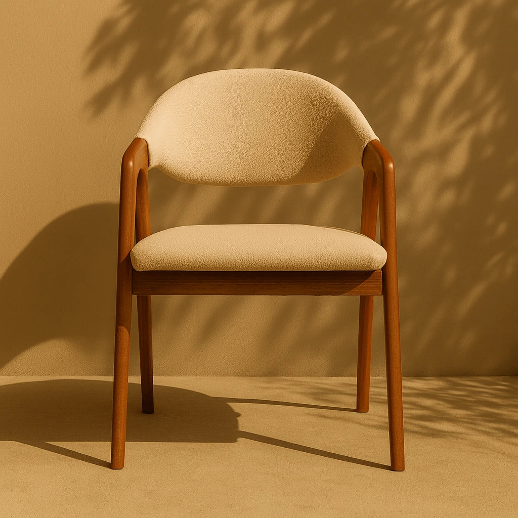 Bu sandalye, masif kayın ağacından üretilmiştir. Tasarımda akışkan ve yumuşak hatlar kullanılmıştır. Geniş ve kavisli sırt yapısı, hem görsel bütünlük sağlar hem de vücudu destekleyerek konforlu bir oturum sunar. Bütünleşik kolçak yapısı sayesinde sade ve dengeli bir form elde edilmiştir. Ürün, modern ve minimalist iç mekanlara uyum sağlayacak şekilde tasarlanmıştır.