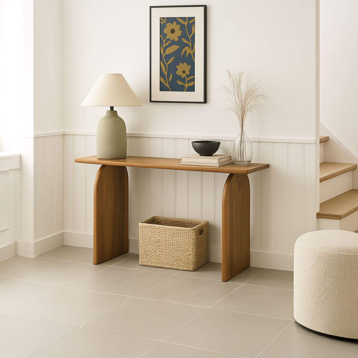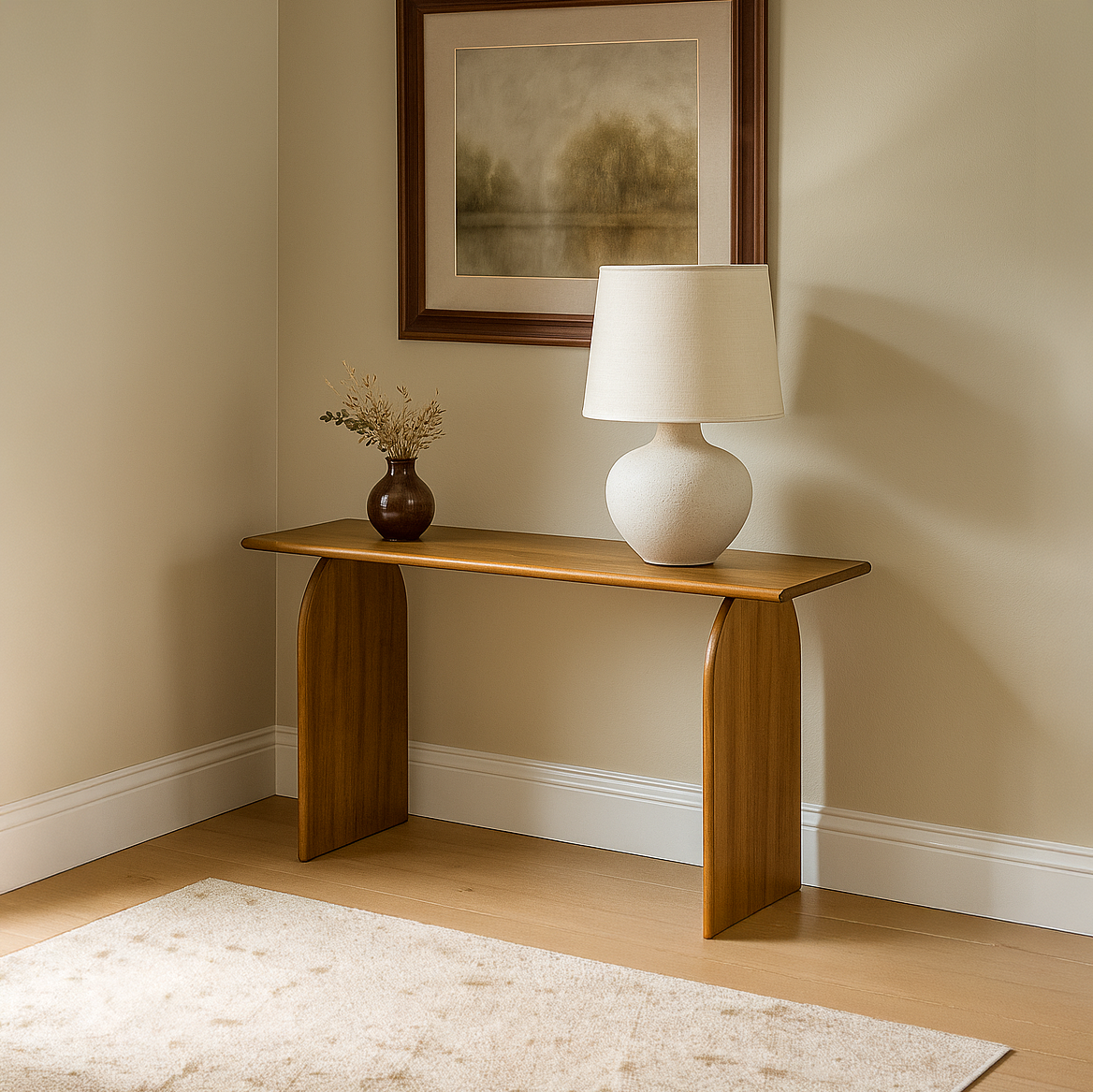 Masif ahşap konsol, doğal ceviz ağacının sıcak dokusunu Japandi stilinin huzurlu ve yalın estetiğiyle birleştiren modern bir tasarımdır. Yumuşak, kıvrımlı hatlara sahip ayak tasarımı ve ince yüzey formu sayesinde, mekâna sade ama etkileyici bir karakter kazandırır. Minimalist çizgiler, doğal malzeme kullanımı ve dengeli oranlar, dresuarı hem dekoratif hem de fonksiyonel bir mobilya parçasına dönüştürür.