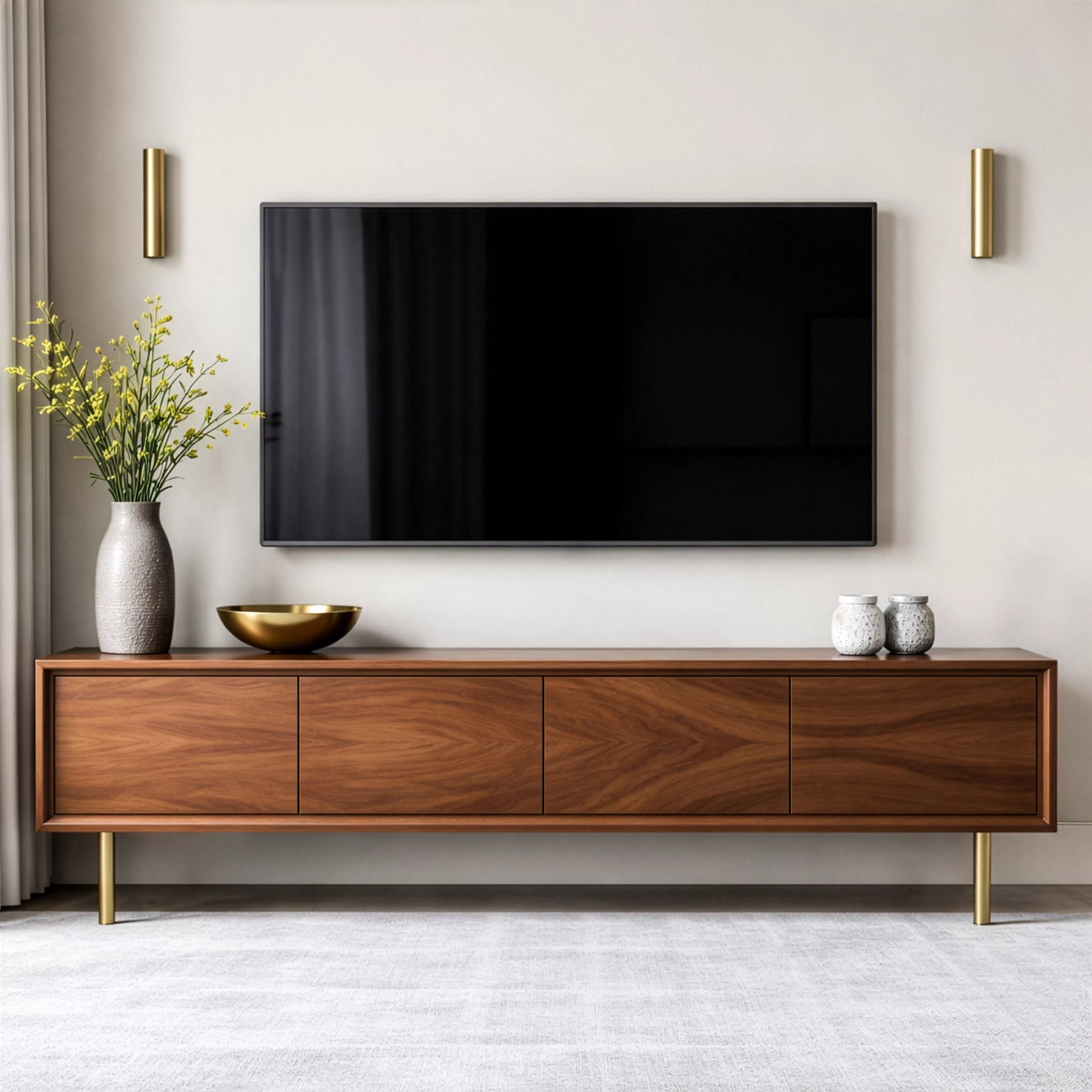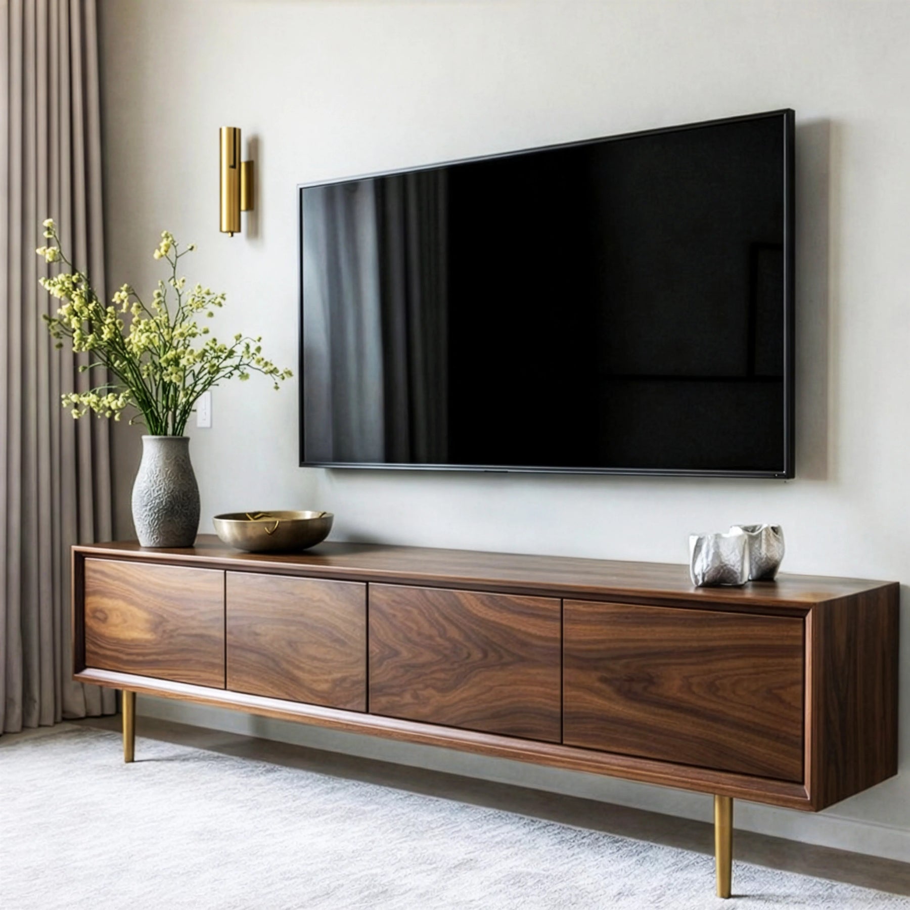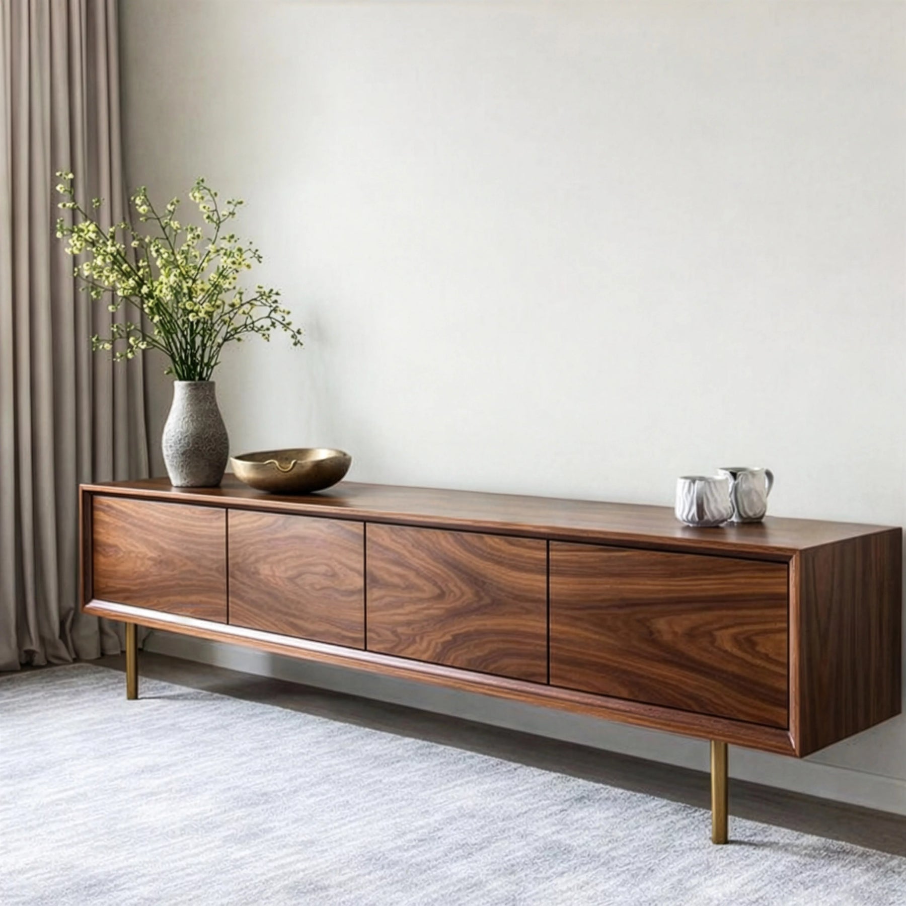 Bu ahşap TV ünitesi, doğal ceviz ağacı kullanılarak üretilmiştir. Ürün tamamen masif yapıya sahiptir ve birinci sınıf el işçiliği ile hazırlanır. Her kapakta ceviz ağacına özgü doğal doku ve desenler yer alır. Metal ayaklar, ünitenin dengeli ve sağlam durmasını sağlar. Hem TV ünitesi hem de konsol olarak kullanılabilecek şekilde tasarlanmıştır.