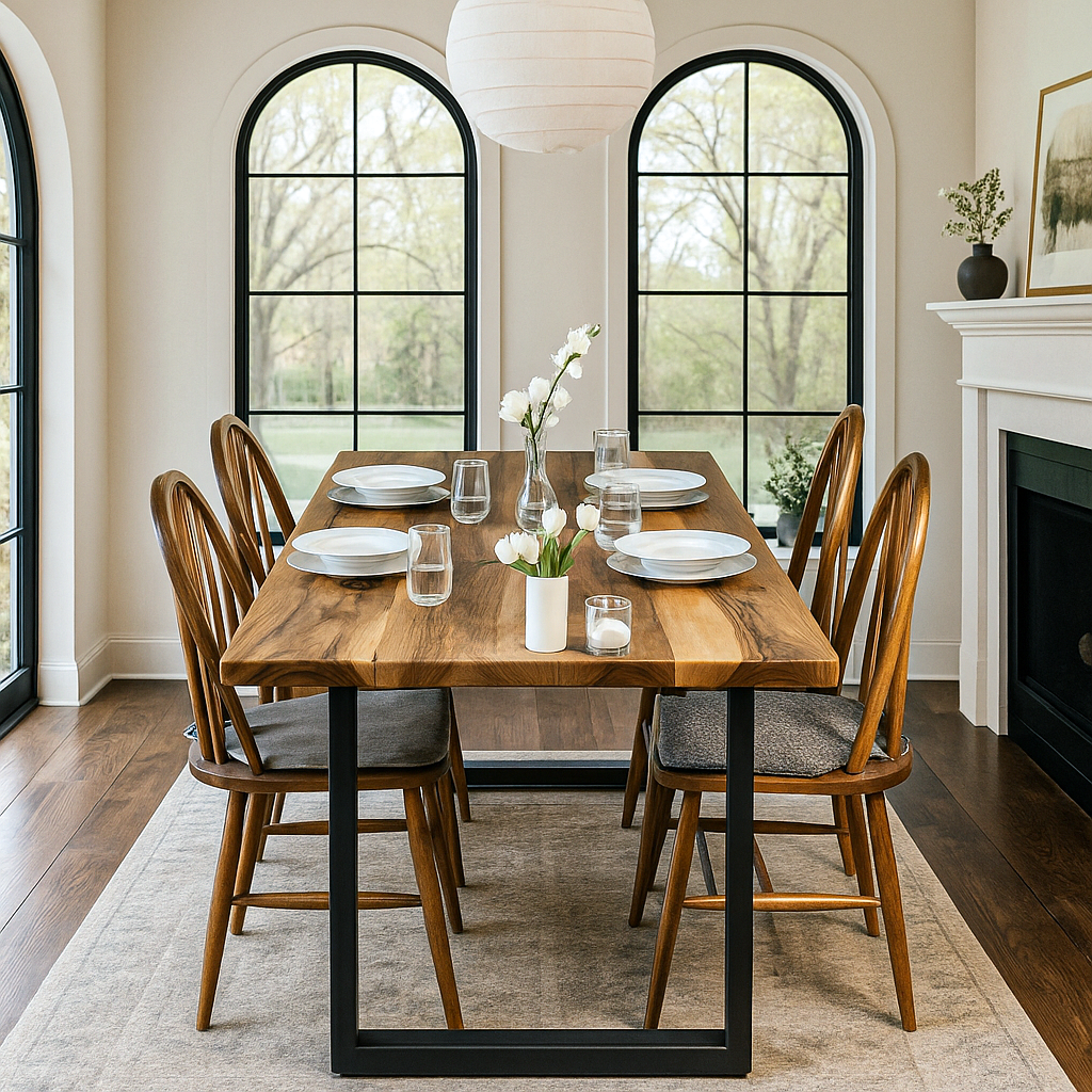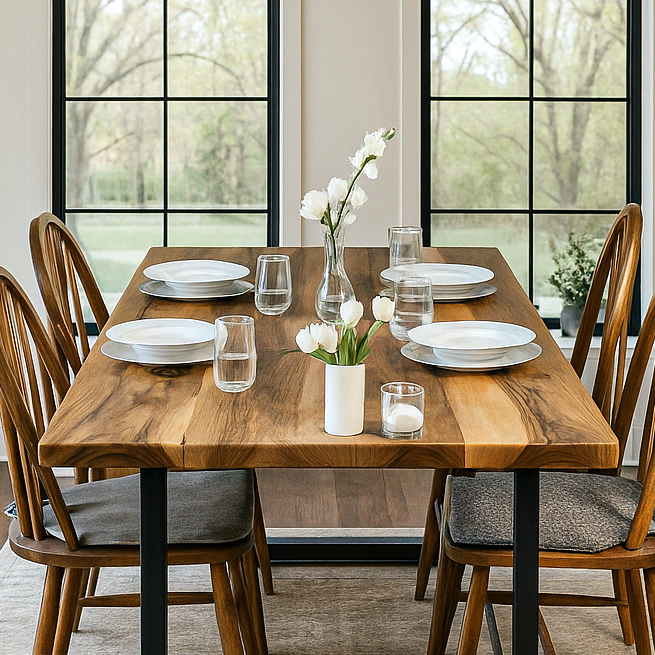Masif yemek masası, doğal ceviz ağacı kullanılarak üretilmiş, el işçiliğiyle hazırlanan eşsiz bir tasarımdır. Bu masif mobilya, doğal dokusuyla hem modern hem de rustik dekorasyonlara uyum sağlayarak yemek odanızda sıcak bir atmosfer yaratır. Dayanıklı metal ayakları ile sağlamlık ve uzun ömürlü kullanım sunar. El işçiliğiyle üretilen ahşap masa, yemek odası, mutfak veya ofis gibi farklı alanlarda kullanım için idealdir.