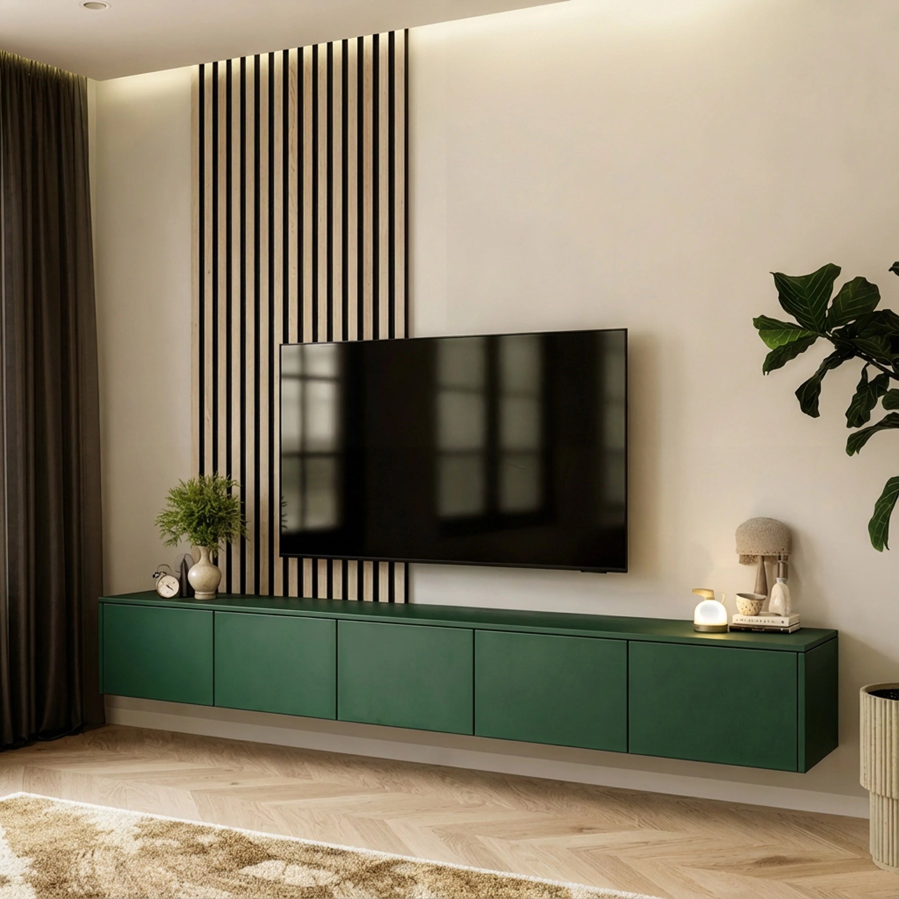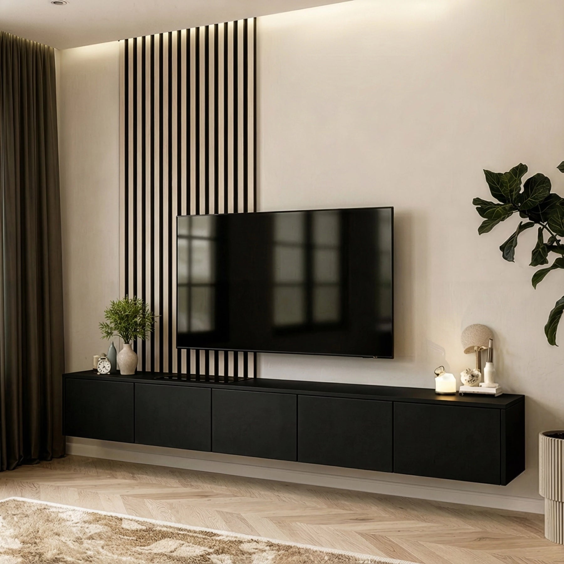 Bu modern TV ünitesi, lake boyalı MDF malzemeden üretilmiştir. Ürün duvara monte edilen yüzer formda tasarlanmıştır. Kulpsuz kapak yapısı sayesinde sade ve düz bir görünüm sunar. Duvara asılı yapı, zemin alanını boş bırakarak mekanda daha ferah bir kullanım sağlar. Siyah başta olmak üzere farklı renk seçenekleri mevcuttur. TV ünitesi, modern ve çağdaş iç mekanlara uyum sağlayacak şekilde tasarlanmıştır.