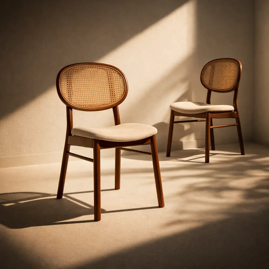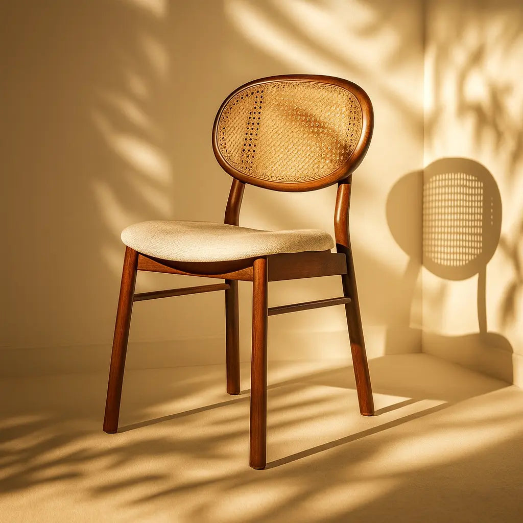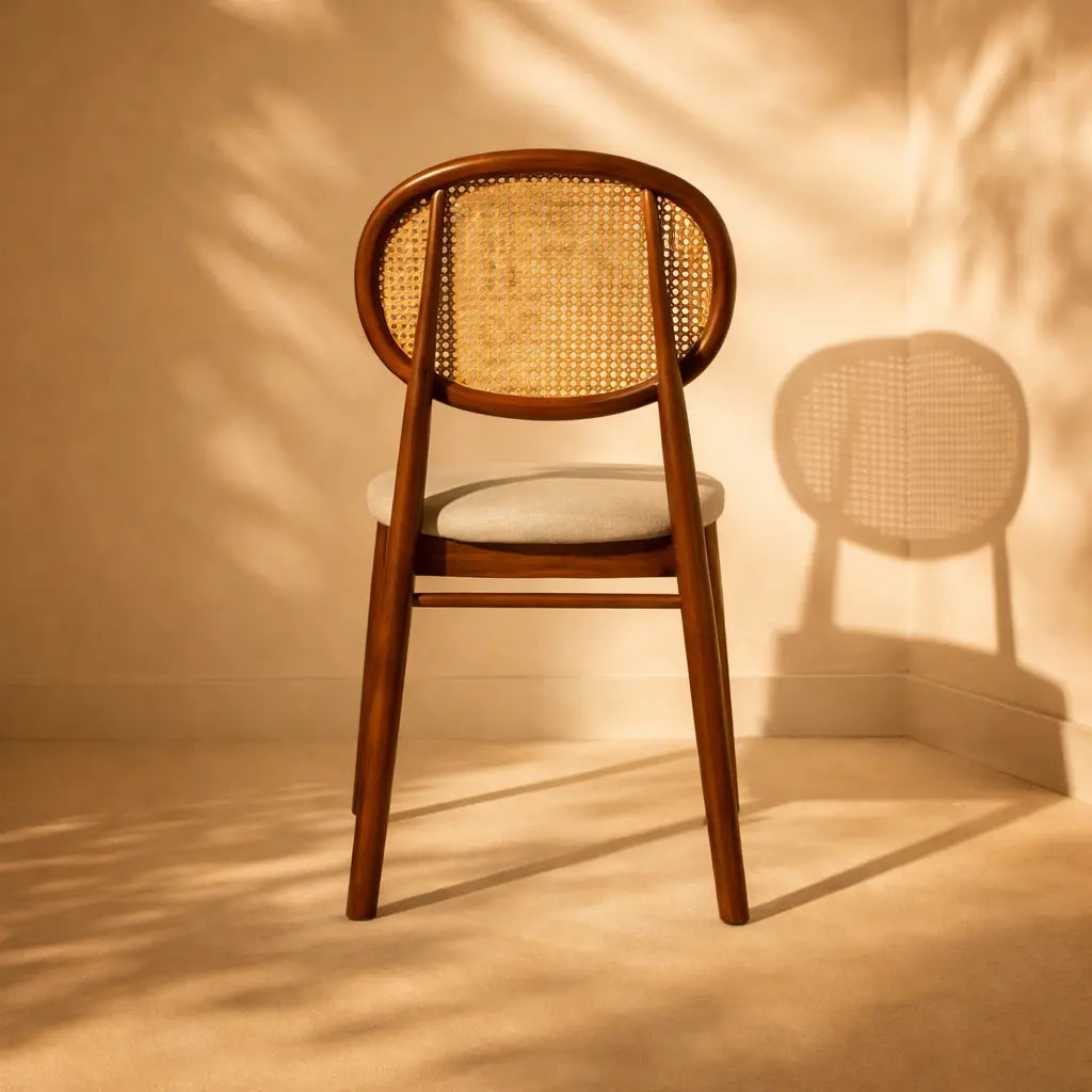 Bu sandalye, masif kayın ağacından üretilmiştir. İskandinav tarzına uygun sade bir tasarıma sahiptir. Sırt bölümünde dairesel medalyon formu ve doğal hazeran örgü kullanılmıştır. Hazeran yapı, sandalyeye hafiflik kazandırırken ferah bir kullanım sunar. Ürün hem retro hem de modern iç mekanlara uyum sağlayacak şekilde tasarlanmıştır.