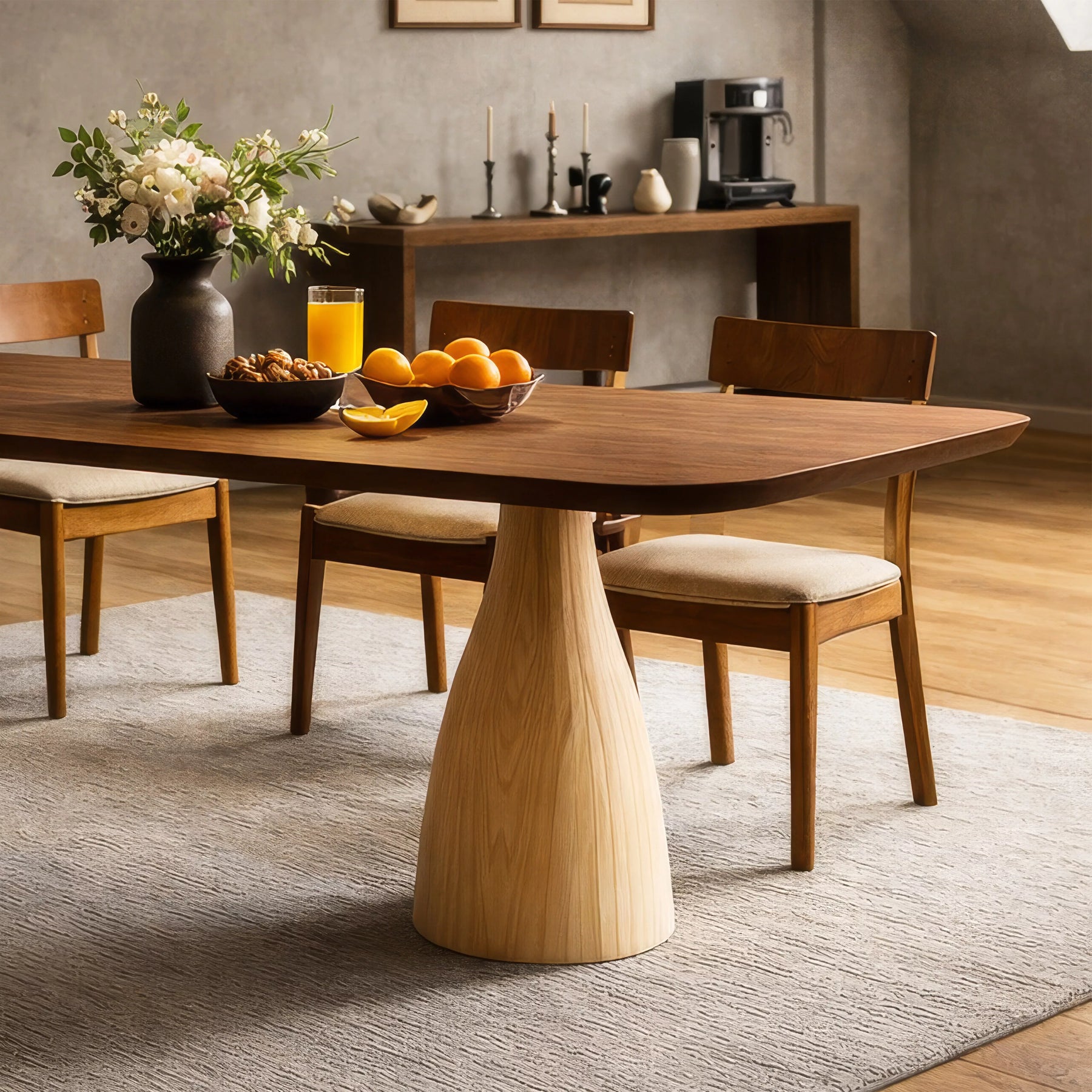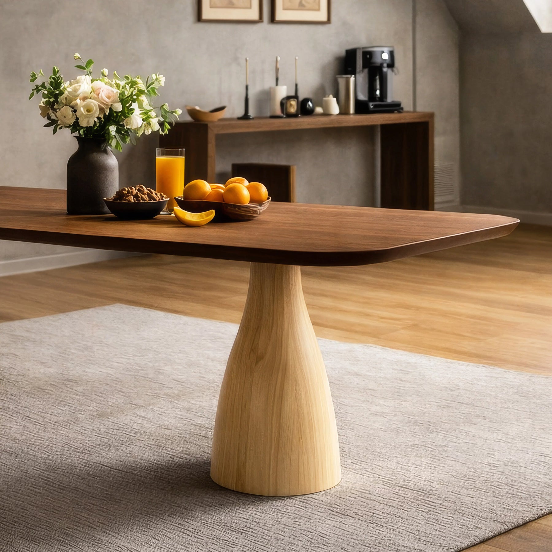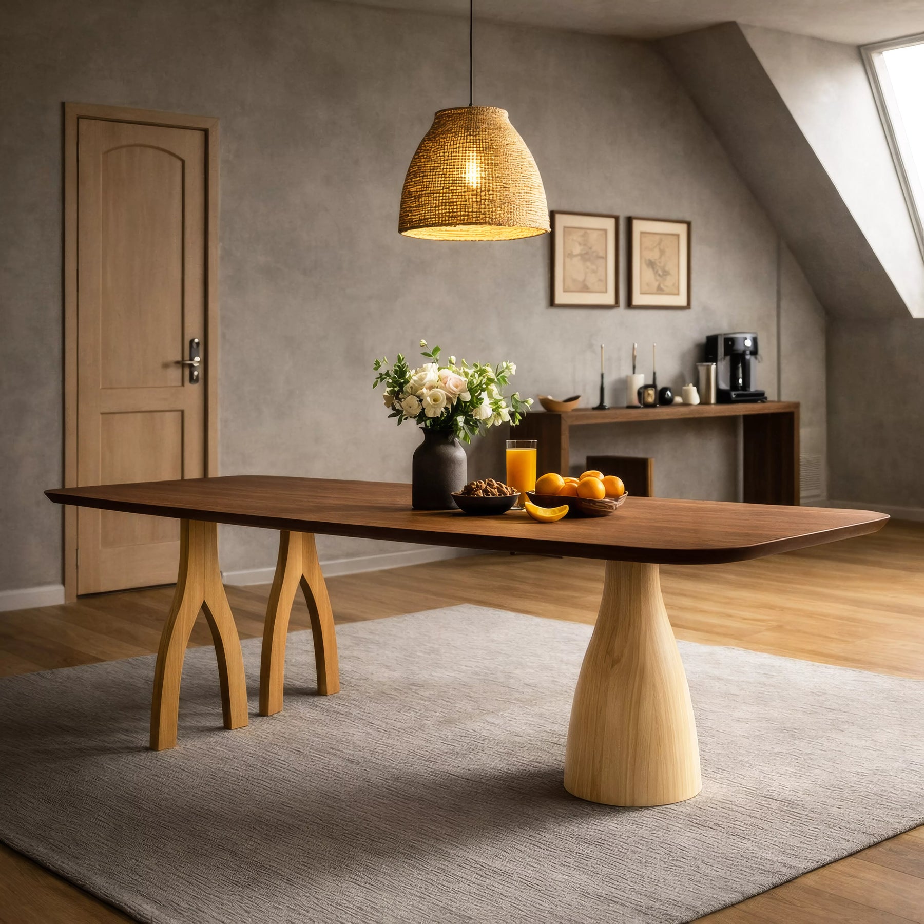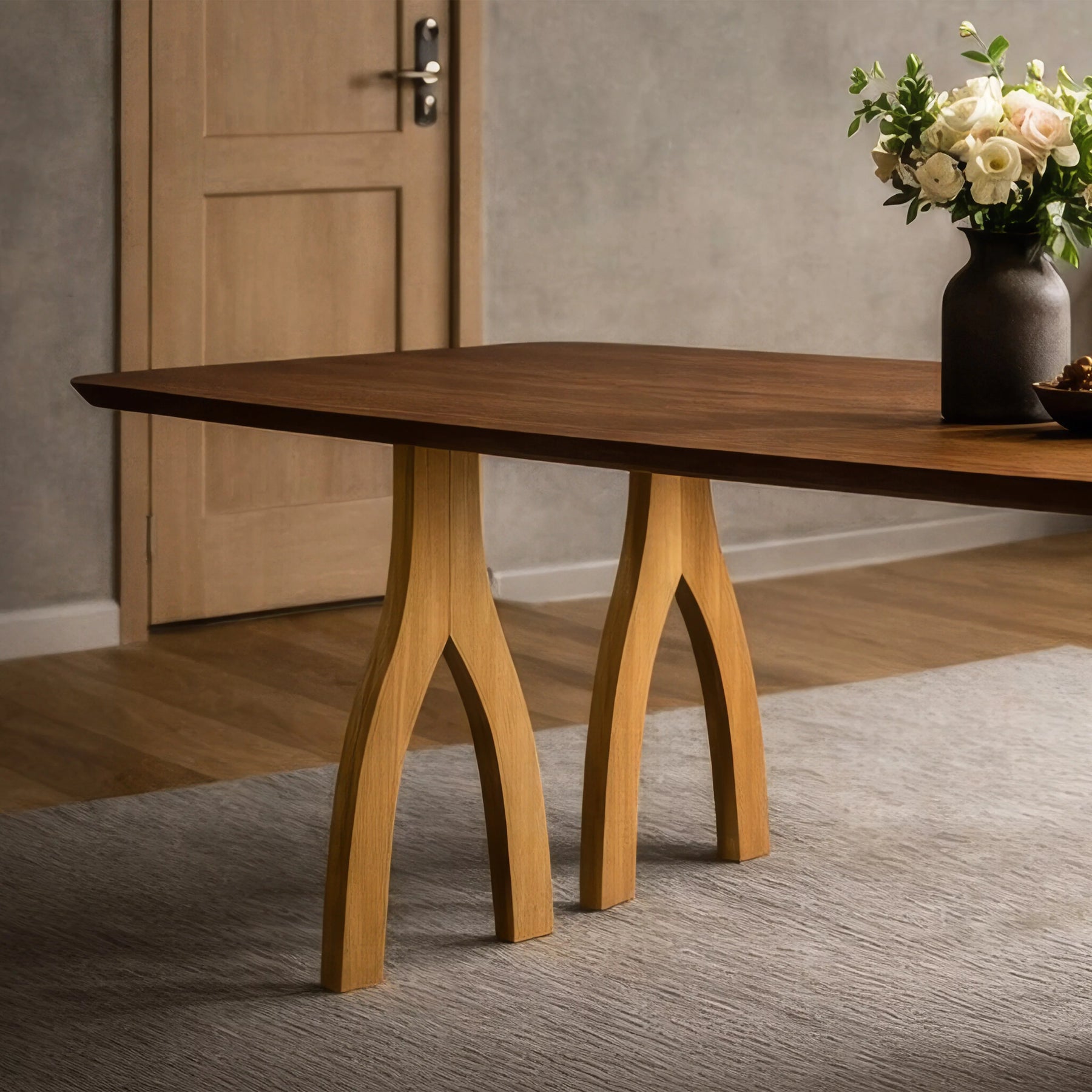 Bu masif yemek masası, tamamen kestane ağacından üretilmiştir. Kestane ağacının dayanıklı yapısı ve doğal dokusu ön plandadır. Masa, asimetrik ayak tasarımıyla modern bir görünüm sunar. Bir tarafta geniş gövdeli ayak, diğer tarafta kavisli çift ayak yapısı bulunur. Bu tasarım, masaya dengeli ve farklı bir form kazandırır. Ürün hem modern hem de zamansız iç mekanlara uyum sağlar.