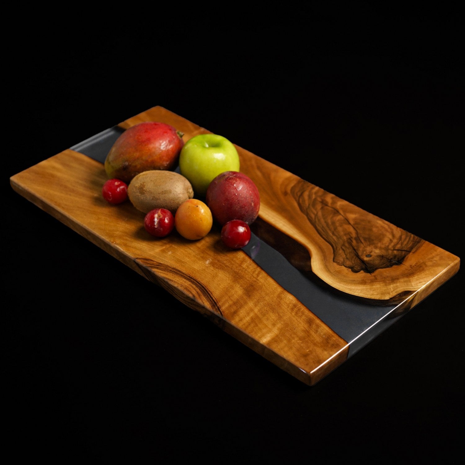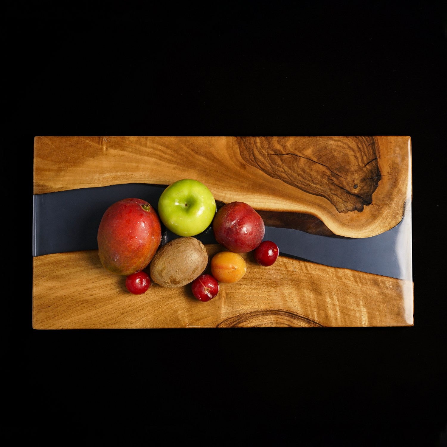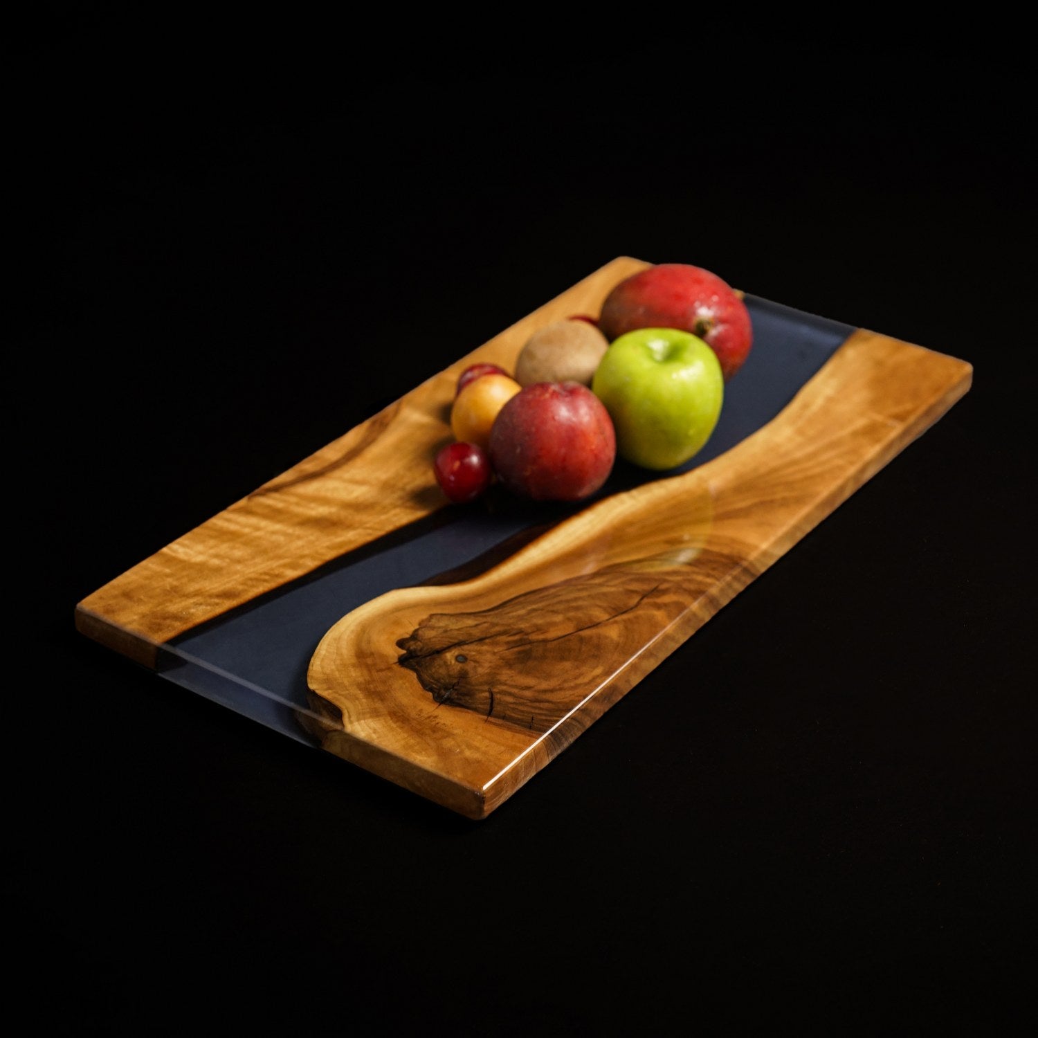 Bu peynir sunum tahtası, peynir, zeytin, meyve veya tatlı sunumları için mükemmeldir. Epoksi koyu mavi detayı, ahşap sunum estetiğini çağdaş bir seviyeye taşır. Yemek masanızda veya mutfak tezgahınızda dekoratif bir parça olarak da kullanılabilir.