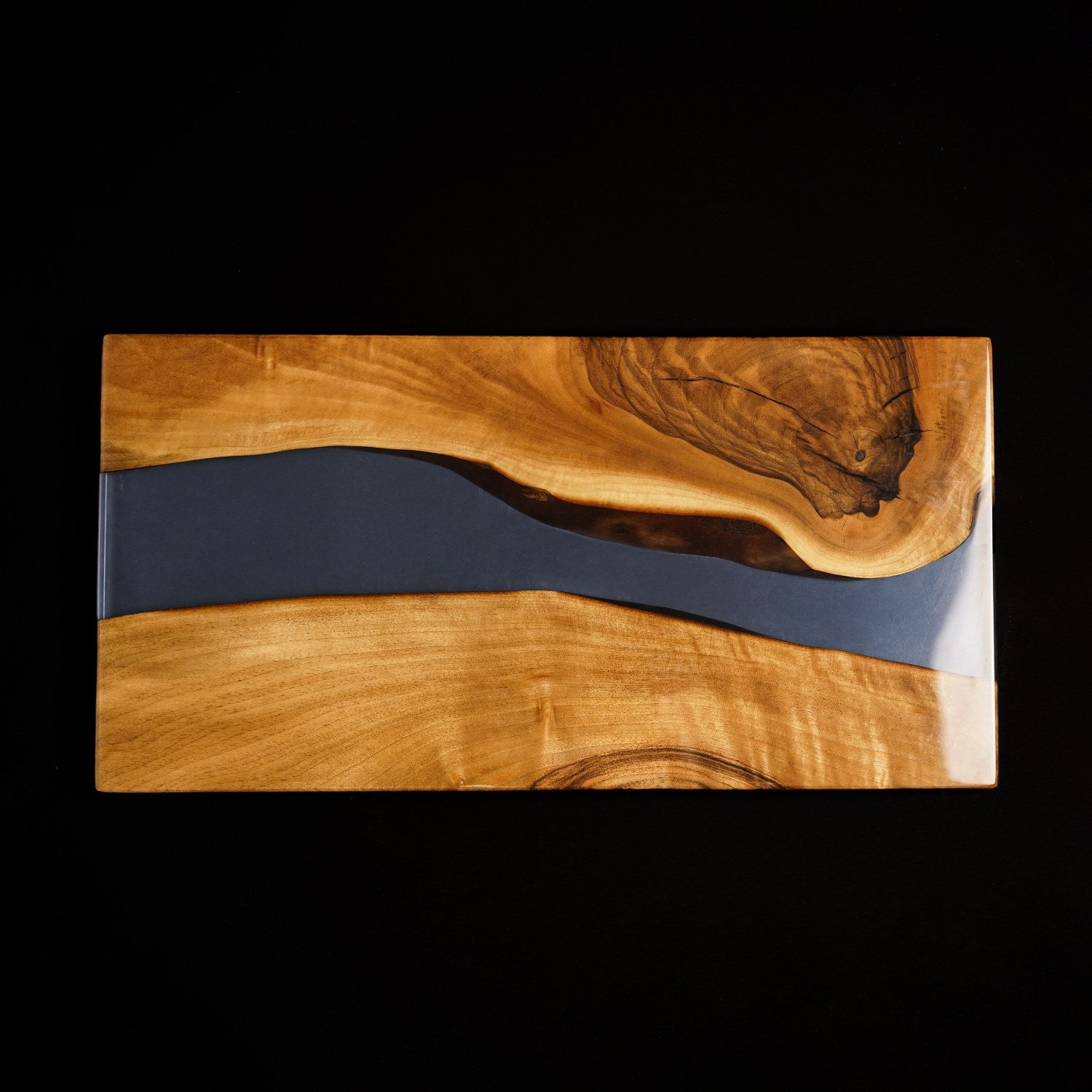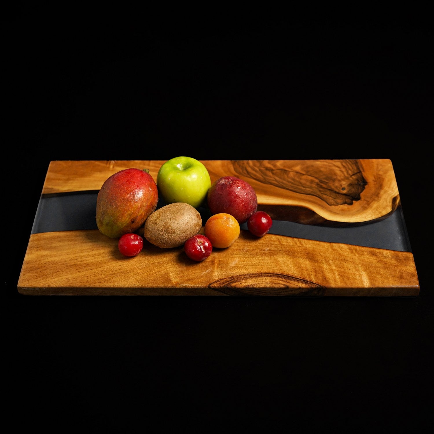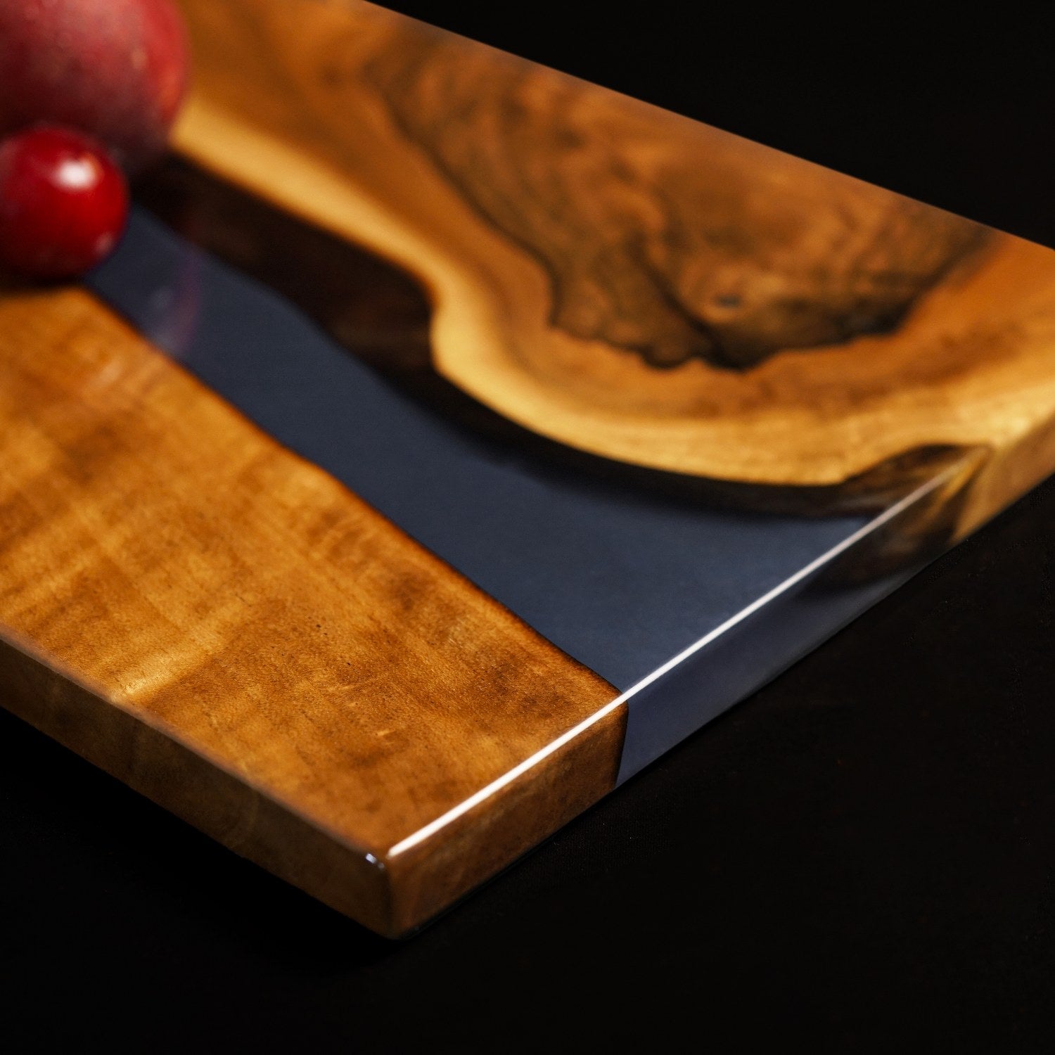 Bu peynir sunum tahtası, peynir, zeytin, meyve veya tatlı sunumları için mükemmeldir. Epoksi koyu mavi detayı, ahşap sunum estetiğini çağdaş bir seviyeye taşır. Yemek masanızda veya mutfak tezgahınızda dekoratif bir parça olarak da kullanılabilir.