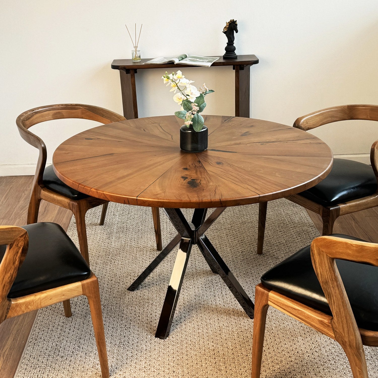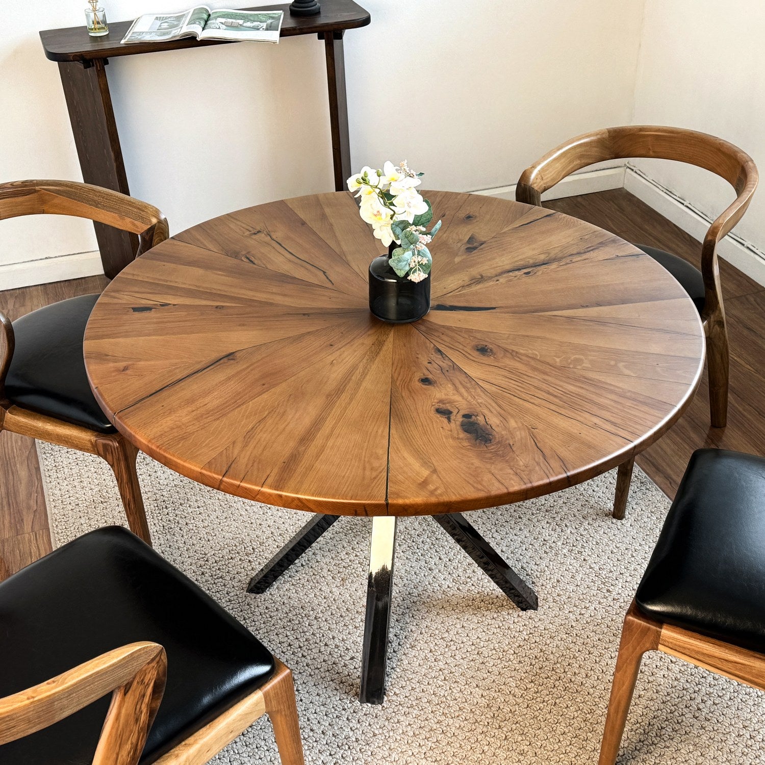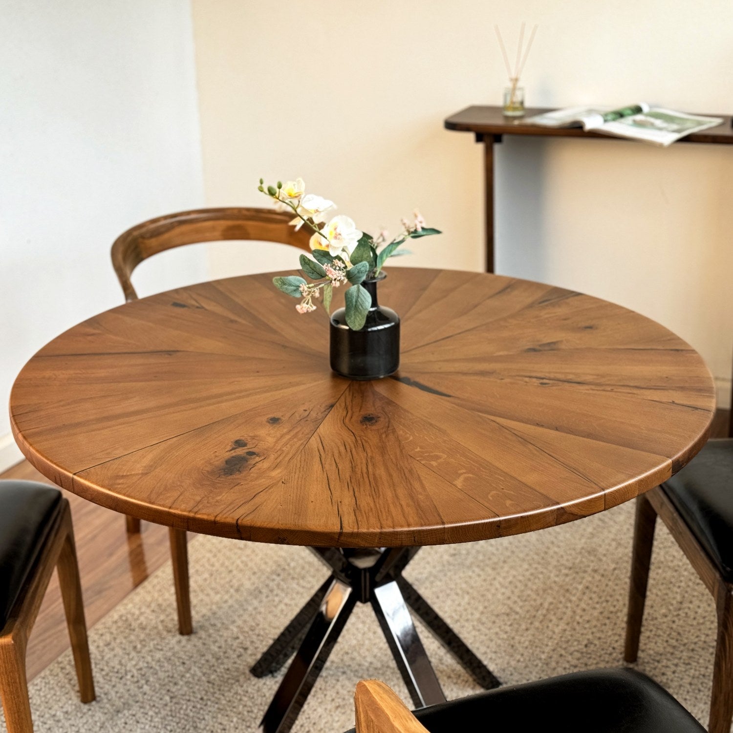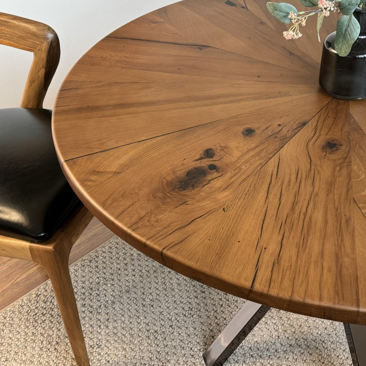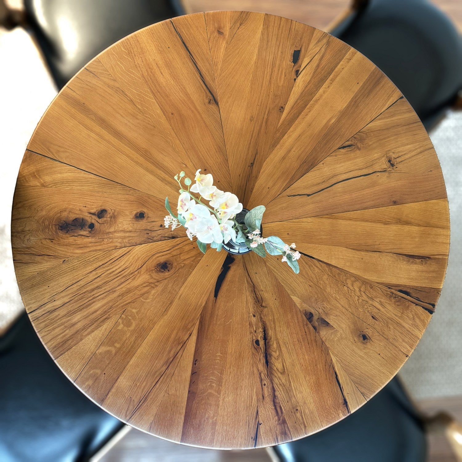 Yuvarlak yemek masası, masif meşe ağacından üretilmiş olup, doğal dokusu ve sıcak tonlarıyla her alanda zarif bir estetik sunar. Mutfak masası olarak da kullanımı oldukça şık ve pratiktir. Masif meşe tablası ile modern ve şık bir görünüm sunan yuvarlak masa, alan tasarrufu için çözüm sağlar. El işçiliği ile üretilen ahşap masa, metal ayaklarının pratik ve dayanıklı yapısıyla da dikkat çeker. Diğer masif yemek masası modelleri için tıklayın!