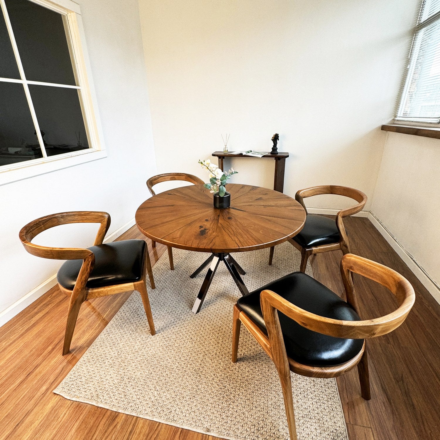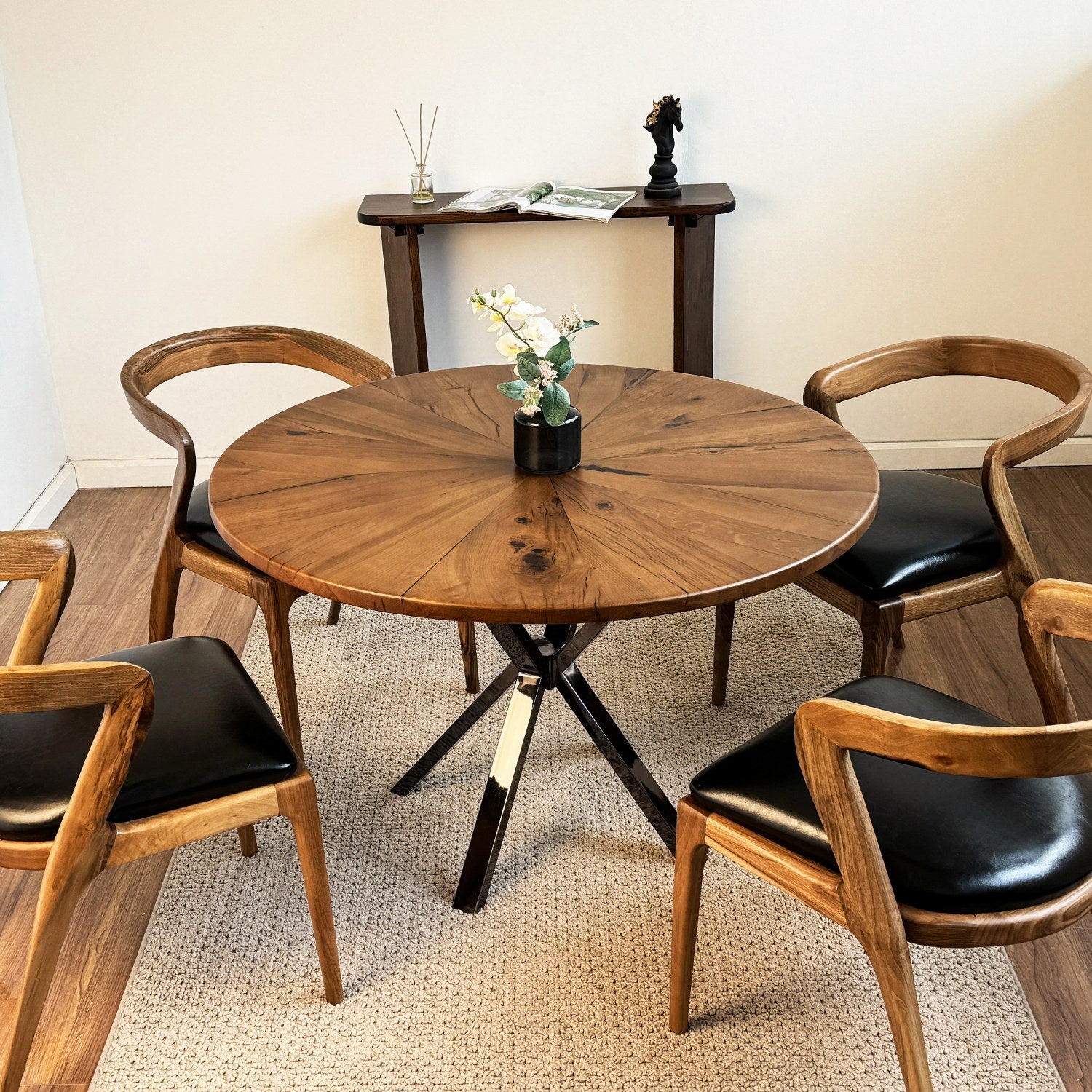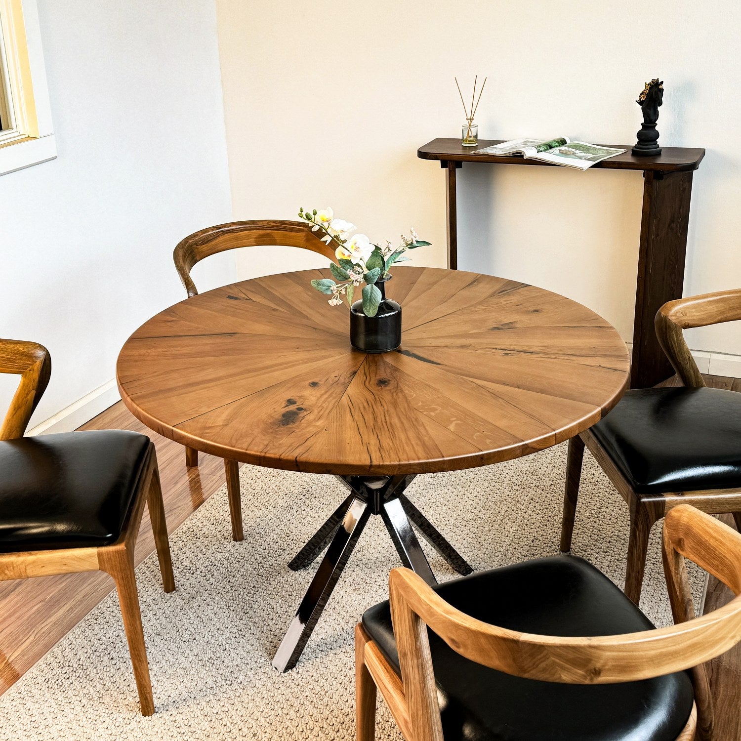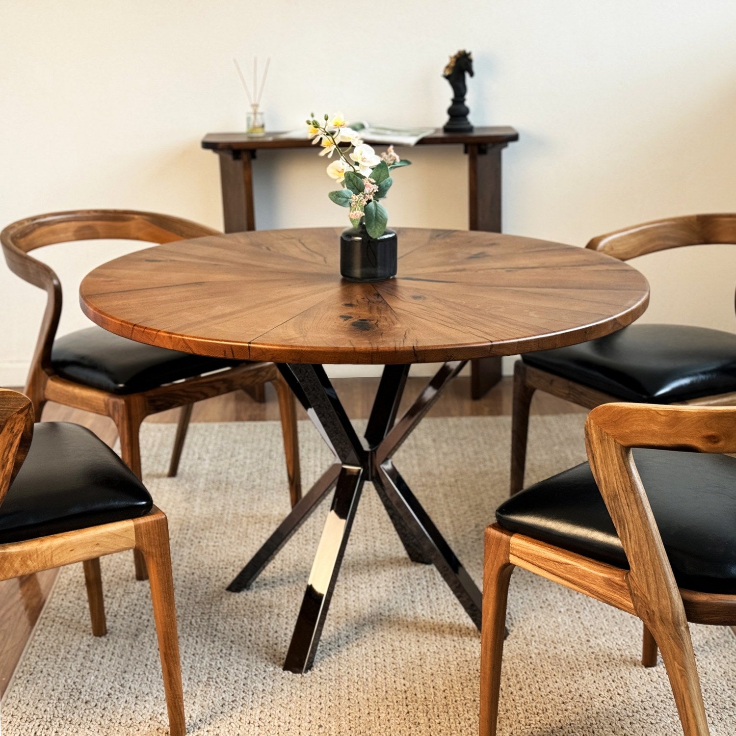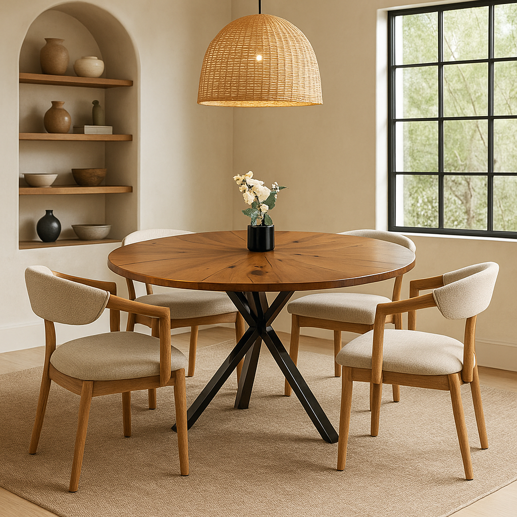 Yuvarlak yemek masası, masif meşe ağacından üretilmiş olup, doğal dokusu ve sıcak tonlarıyla her alanda zarif bir estetik sunar. Mutfak masası olarak da kullanımı oldukça şık ve pratiktir. Masif meşe tablası ile modern ve şık bir görünüm sunan yuvarlak masa, alan tasarrufu için çözüm sağlar. El işçiliği ile üretilen ahşap masa, metal ayaklarının pratik ve dayanıklı yapısıyla da dikkat çeker. Diğer masif yemek masası modelleri için tıklayın!